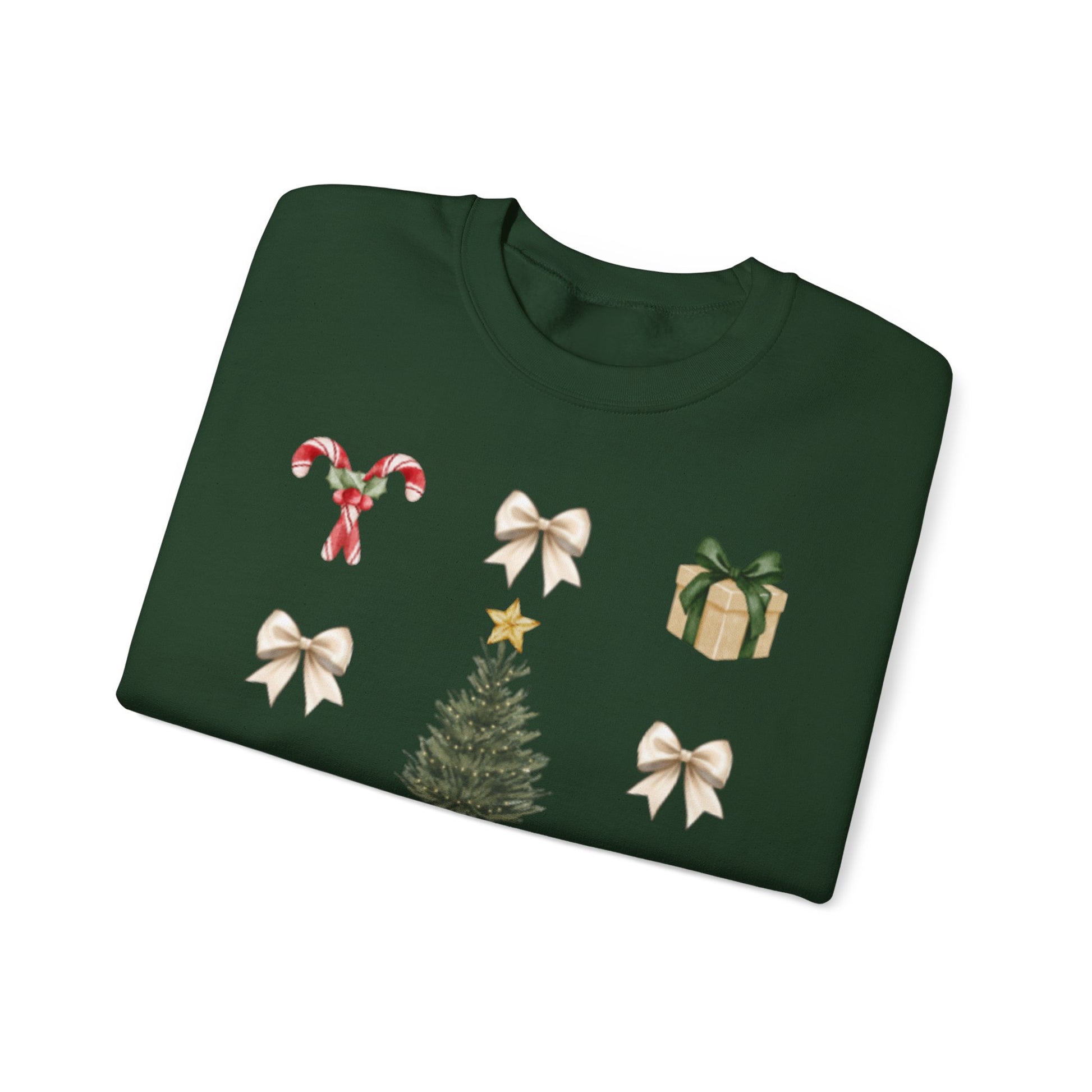 This cozy sweatshirt feels like a quiet, snow-dusted evening by the window. Soft cream fabric carries a gentle grid of watercolor-style holiday motifs — a small fir tree, ribbon bows, wrapped parcels, candy canes and a tiny festive mug — arranged with calm, minimal charm. The roomy, classic crew cut layers easily over jeans or pajama bottoms, making it the kind of sweater you reach for when you want warmth without fuss. Wear it during low-key holiday mornings, slow evenings decorating the tree, or when hosting a relaxed family movie night. The embroidered-ready layout and subtle palette keep the look elevated yet homey — familiar, comfortable, and quietly cheerful.