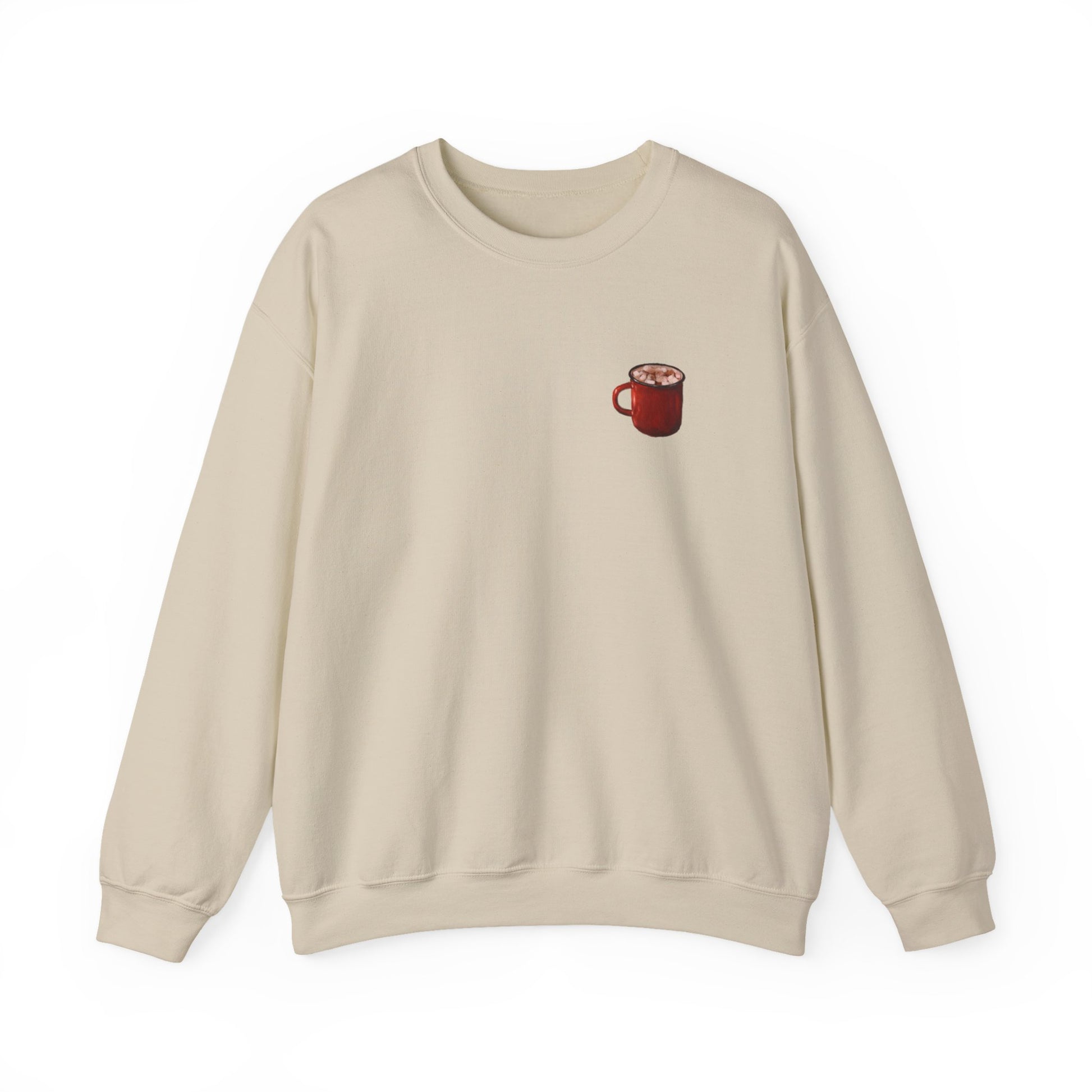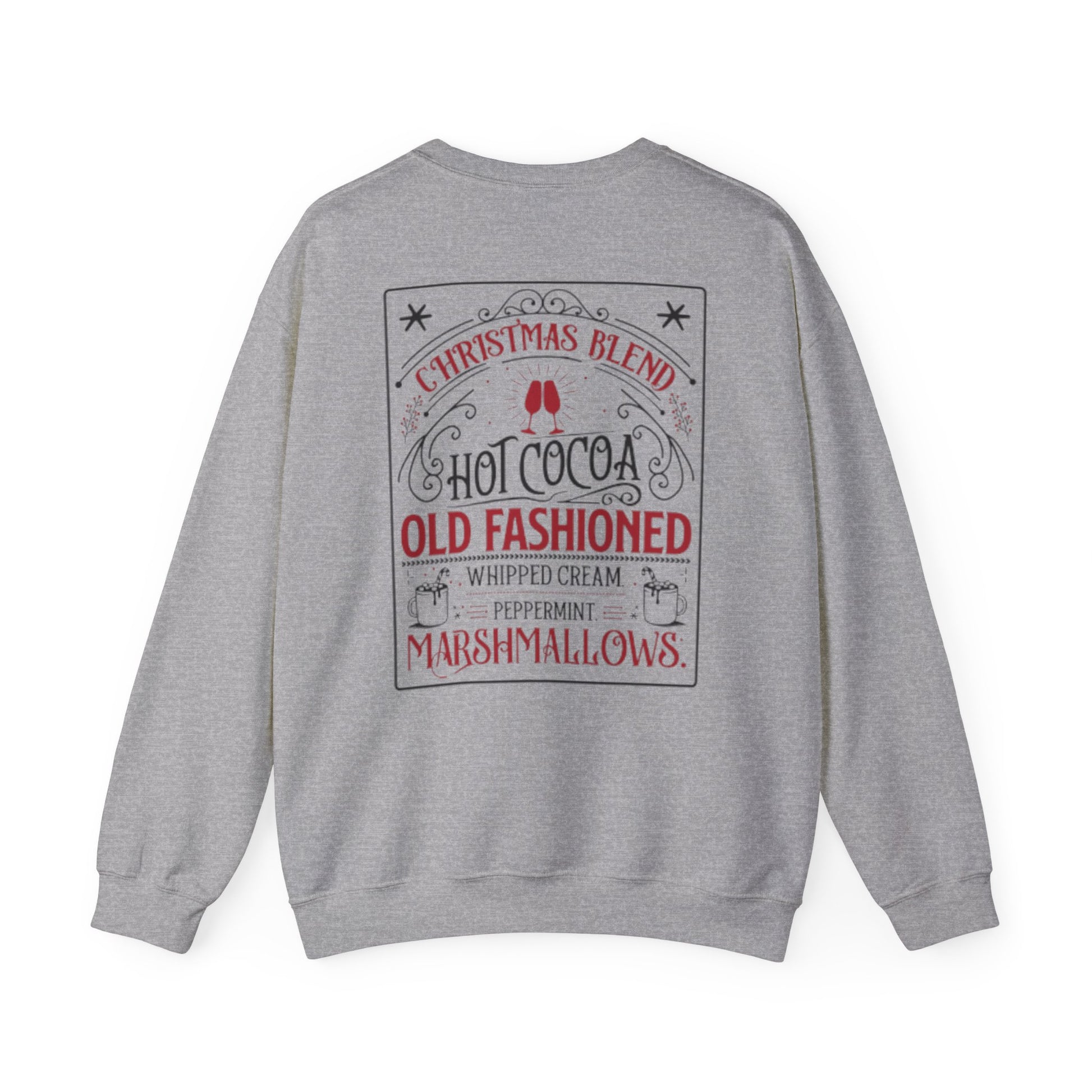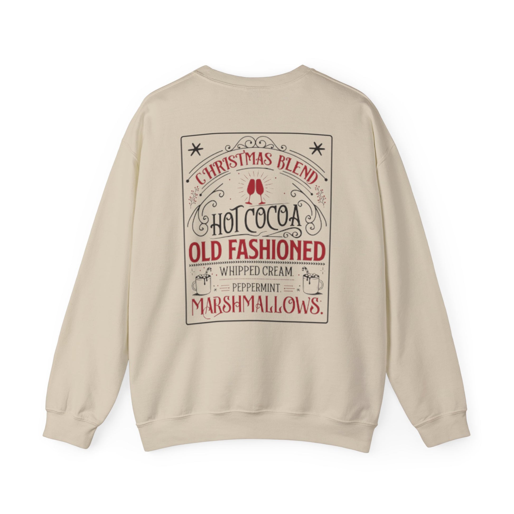 A soft, midweight crewneck that feels like an extra layer of quiet winter mornings. The front holds a tiny embroidered mug — a familiar, homey detail — while the back carries a vintage-style label celebrating “Hot Cocoa, Old Fashioned” with peppermint, whipped cream, and marshmallows called out in graceful lettering. Wear it over pajamas or jeans; it settles around your shoulders and keeps the chill away without bulk. The breath of cotton with a touch of polyester gives it structure and durability, and the clean ribbed collar and double-needle stitching mean this sweatshirt will look lived-in, not worn-out. It reads like a small, cozy ritual: a warm cup, a soft sweater, and a slow evening by lamplight or the glow of holiday lights.