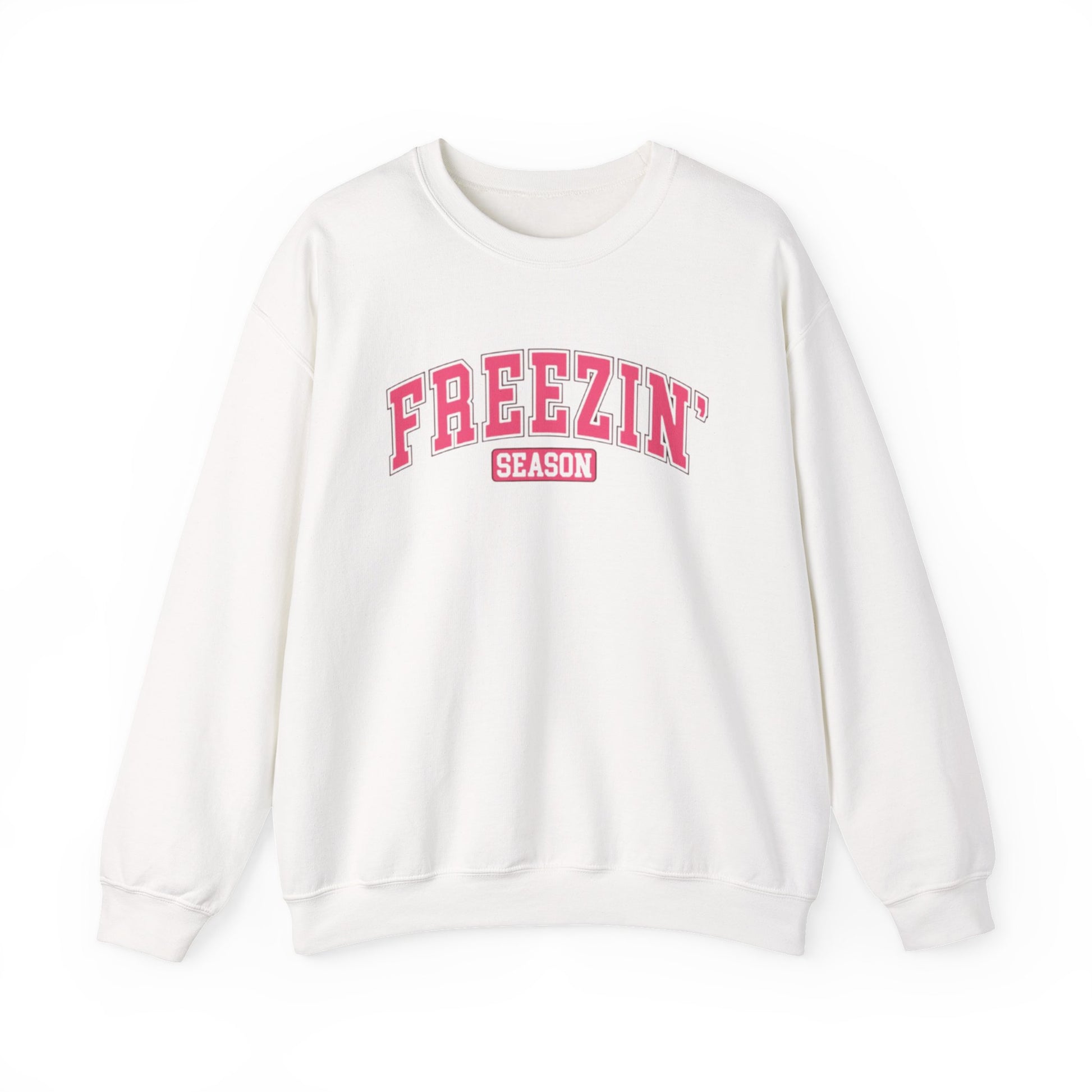A clean, cozy crewneck sweatshirt that feels like a warm exhale on crisp mornings. Soft, medium-heavy fabric holds shape without weighing you down. The simple white canvas puts the pink "FREEZIN' SEASON" lettering front and center — playful, a little nostalgic, and easy to layer over tees or under coats. Wear it on slow weekends, walks through frosty neighborhoods, or curled up with a hot mug. The classic fit and reinforced stitching mean it moves with you and lasts through repeated washes, while the tear-away label keeps the neck itch-free. Subtle athletic lines and cardigan-friendly proportions give it an effortless, lived-in look that slots naturally into a casual winter wardrobe.