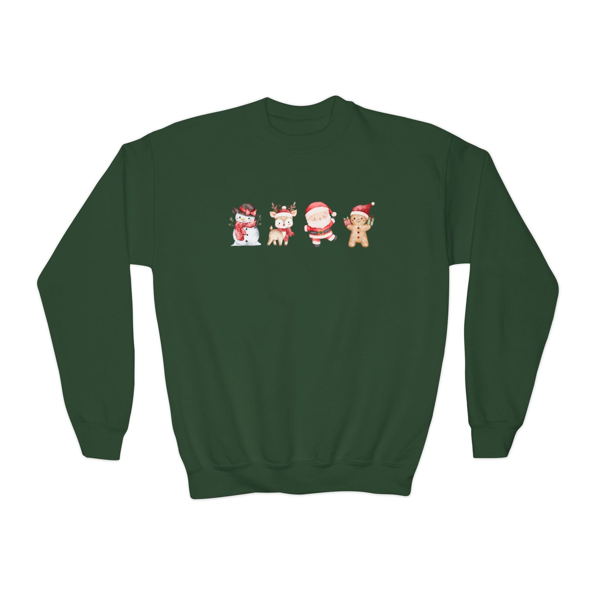 This cozy youth crewneck sweatshirt brings playful holiday spirit to chilly days. Soft heather gray knit carries a row of tiny festive characters across the chest — a snowman, reindeer, Santa and friends — rendered in warm, whimsical colors that pop without feeling loud. The medium-heavy fabric and ribbed collar give structure and warmth, while the loose fit lets kids move freely through snowball fights, cookie baking, or quiet storytime by the tree. Durable blended fibers hold embroidered or printed details well, and the tear-away label keeps little necks comfortable. Built with safety and quality standards in mind, it’s a simple, cheerful layer that feels lived-in and loved.