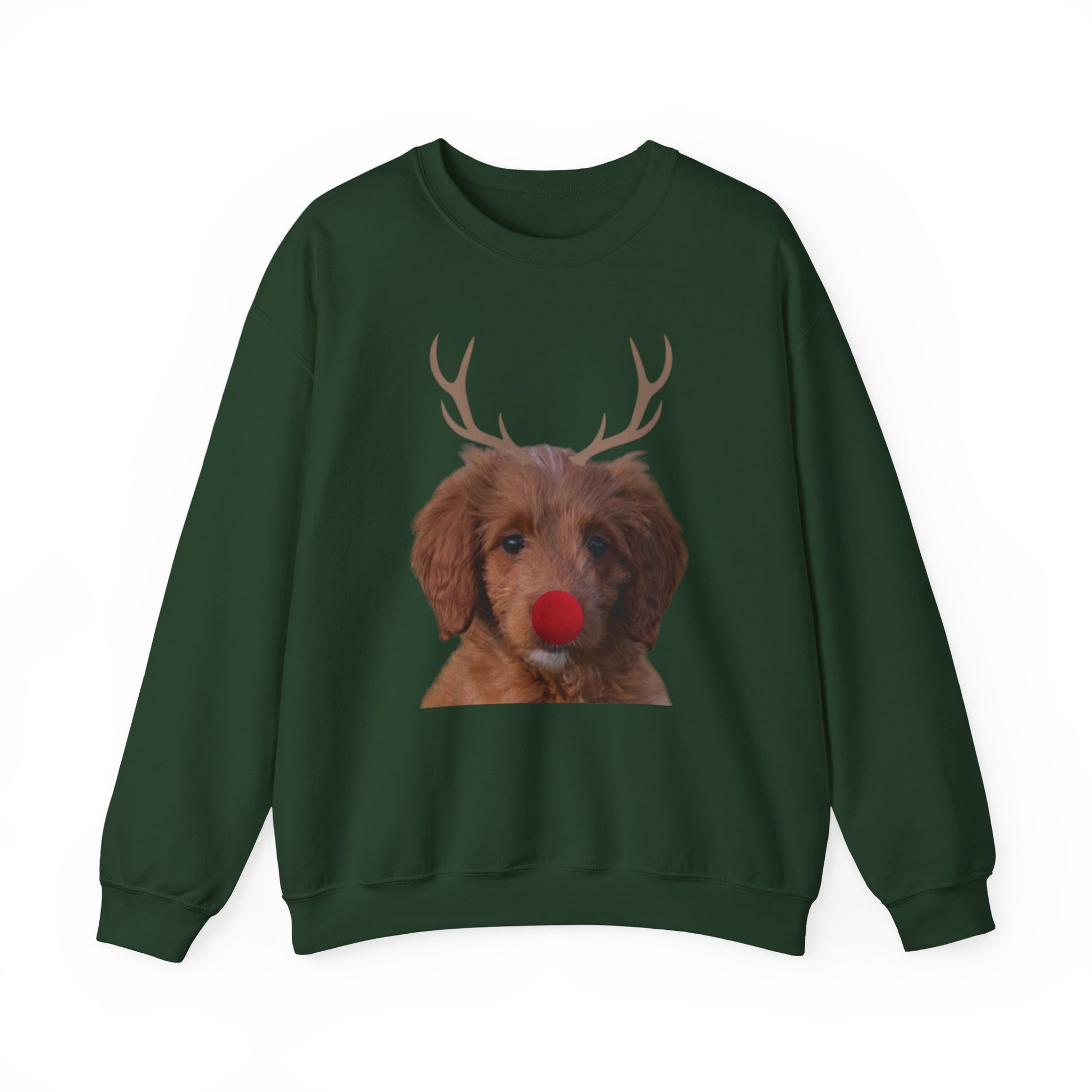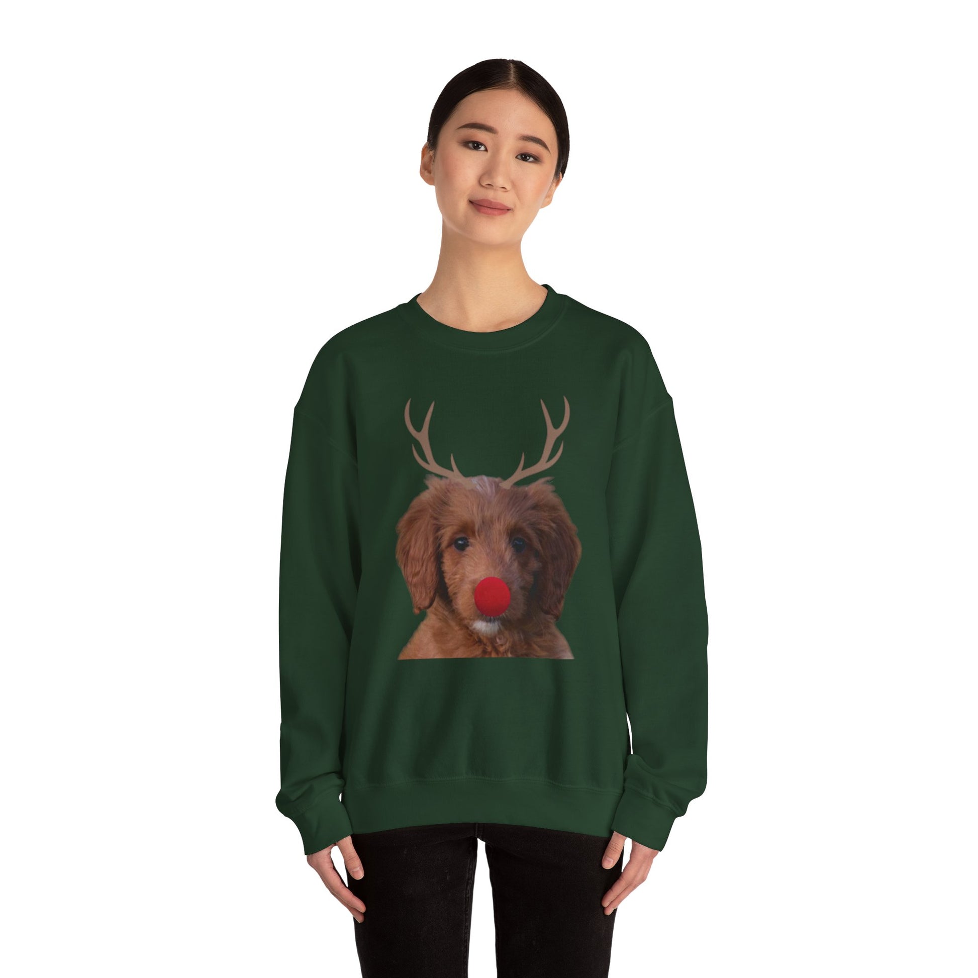 A cozy crewneck that brings a soft, homey wink to winter days. The front shows a warm-furred pup wearing tiny antlers and a bright red nose — playful, slightly mischievous, and impossible not to smile at. Wear it layered over a favorite tee for chilly morning walks, or curled up by a woodstove with hot chocolate. The classic, slightly roomy cut breathes easy while the medium-heavy cotton-poly blend keeps you comfortably warm without feeling bulky. Subtle details like a ribbed collar and reinforced double-needle stitching mean this sweatshirt looks lived-in and keeps its shape through many washes. If your holiday style leans whimsical and warm, this sweatshirt brings that gentle, laugh-out-loud moment into everyday life.